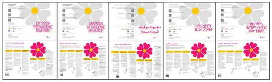 Vaccine information leaflets distributed in the informal settlements. From right to left: English, French, Arabic, Tigrinya, and Amharic. The leaflets were distributed according to the predominant language in the informal settlement. Leaflets in English and French were mainly distributed at the stations, while in the Collatina settlement, the leaflets distributed were mostly in Tigrinya and Amharic.