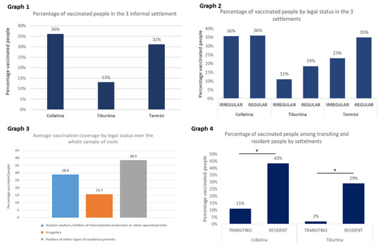 Vaccination coverage in the informal settlements: (Graph 1) average vaccination coverage by settlement; (Graph 2) vaccination coverage by legal status in the 3 settlements; (Graph 3) average vaccination coverage by legal status over the whole sample of visits; (Graph 4) vaccination coverage among transiting and resident people by settlements. (* = p < 0.05, CIs 95%).