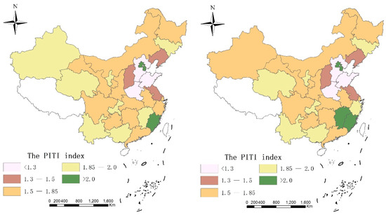 In order to directly reflect the spatio-temporal characteristics of China’s PITI index during the period 2010–2018, this paper uses 2010 and 2018 as the time section and refers to the natural discontinuity classification method to draw the PITI index spatio-temporal differentiation map as shown in Figure 1.