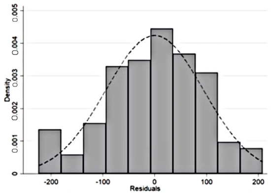 Finally, a normality test is performed. Normality testing refers to testing whether the basic assumption is that the residuals follow a normal distribution with a mean value of 0 holds. This paper uses Shapiro–Wilk to test the normality of the residuals [50], and the results are shown in Figure 2 and Table 4.After testing, the assumption that the residuals do not follow a normal distribution is rejected.