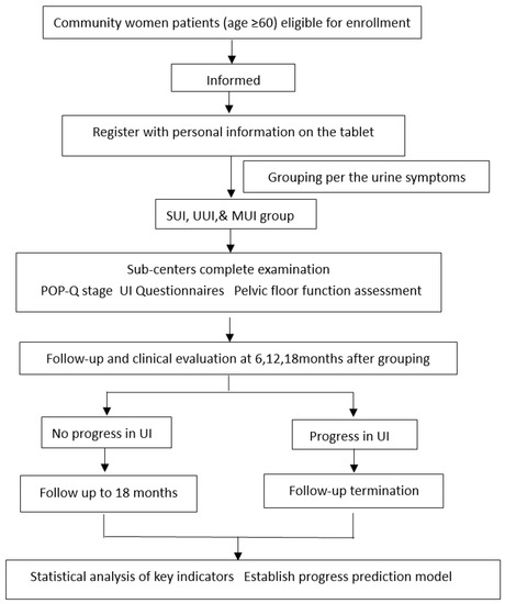 The study is conducted as a prospective multicenter study to collect epidemiological factors for the analysis of the impacts of physical activity, chronic diseases, pregnancy and delivery, genetic characteristics, pelvic floor function assessment (e.g., pelvic floor muscle strength, pelvic floor ultrasound, pelvic floor electrophysiology, and morphology index), and other factors in elderly women. Data analysis will be conducted by means of bioinformatics and mathematical modeling objectives to investigate the influence of UI progress and prognosis related factors, and to construct a prediction model of UI progress in elderly women. This study is carried out by Peking University People’s Hospital in Beijing, in cooperation with Wuhan University People’s Hospital in Wuhan, China. A total of 800 patients will be recruited, 400 from Beijing and 400 from Wuhan. Four district-level hospitals in Beijing are involved as the sub-centers in Beijing, namely Tongzhou District Maternal and Child Health Care Hospital, Fengtai District Maternal and Child Health Care Hospital, Fangshan District Maternal and Child Health Care Hospital, and Changping District Maternal and Child Health Care Hospital. Two district-level hospitals in Wuhan are involved as the sub-centers in Wuhan, namely Wuhan Qingshan District Maternal and Child Health Hospital and Wuhan East Lake New Technology Development Zone Fozu Mountain Community Health Service Center. Each sub-center will select communities within the district that are targeted to recruit elderly female patients who are ≥60 years of age with mild to moderate UI by distributing a research subject leaflet. Eligible women need to sign informed consent before being enrolled in the cohorts. Figure 1 illustrates the flow diagram of the study for all subjects.