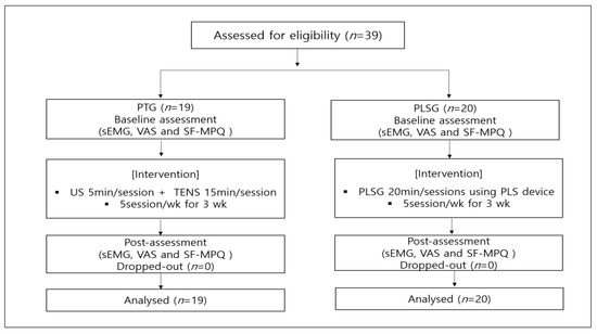 Thirty-nine female adults aged between 18 and 70 years old were recruited at the department of rehabilitation medicine, Presbyterian Medical Center, located in Jeonju, Korea. These participants visited the center due to complaints of prolonged muscular pain. The participants were diagnosed as having myalgia by experienced clinicians at the department of rehabilitation medicine, Presbyterian Medical Center on the basis of muscle and general physical examination, and prolonged muscular pain for at least 3 months. Participants experienced muscle pain in at least one or more sites of the neck, shoulder, back, and waist areas. This study selected female patients who satisfied the inclusion criteria based on the screening test and submitted a signed informed consent form (ICF) after receiving a detailed explanation about the clinical trial. Patients were excluded in this study if they had any diseases of the organs, such as liver disease, cancer, rheumatic disease, thyroid disease, skin disorders, or hypersensitivity; those with skin desensitization; those who had undergone drug administration or medical device applications in another clinical trial within 30 days from the start of the present study; and those whom the investigator determined to be ineligible to participate in the clinical trial (e.g., serious instability, mental illness, minors less than 18 years of age, spinal pain, osteoporosis, and those who could not visit the center for all five sessions per week for 3 weeks). Furthermore, all the selected participants (n = 39) were randomly assigned to either the PLS group (PLSG: n = 20) or PT group (PTG: n = 19).