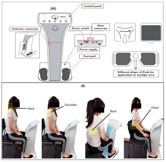 (A) Personal low-frequency stimulation device (CGM MBD-1201) and (B) clinical application of PLS on four different positions, such as the neck, shoulder, back, and waist.