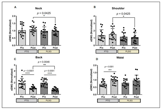 Changes in sEMG values for PTG and PLSG. (A) sEMG score at the neck, (B) shoulder, (C) back, and (D) waist areas of participants. Significant differences were considered statistically at * p < 0.05, ** p < 0.01, *** p < 0.001 and **** p < 0.0001. PLSG, personal low-frequency stimulation group; PTG, physical therapy group; sEMG, surface electromyography.