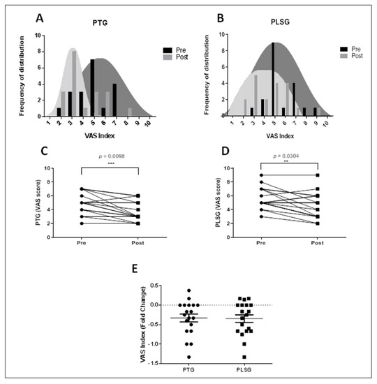 To examine the effects of PTG and PLSG on perceived pain intensity, VAS was utilized to evaluate pain reported by subjects. The VAS values for both pain treatment regimes decreased, indicating pain abatement (Figure 4). Surprisingly, the frequency of distribution of VAS in the PLSG was higher than in the PTG prior to therapy, implying that some patients in PLSG felt more discomfort than PTG participants. Following PLSG treatment, the VAS score dispersion tends to flatten. When the VAS index is standardized between groups, there are no significant differences in VAS fold change between the PTG and PLSG (Figure 4E), suggesting that both interventions reduced perceived pain levels.