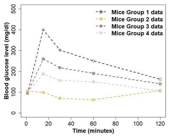 Glucose concentration data for four groups of experimental mice extracted from []. The blue line represents Mice Group 1 glucose concentration level data; Mice Group 2 is denoted by the orange line; Mice Group 3 is denoted by the dark red line; and Mice Group 4 is denoted by the grey line.
