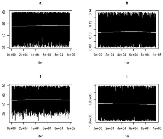 First top panel shows MCMC chain convergence for parameter a and second top panel shows MCMC chain convergence for parameter b. The first bottom panel shows MCMC chain convergence for parameter f and the second bottom panel shows MCMC chain convergence for parameter i. These MCMC convergences are for Model 2 when fitted to Mice Group 1 data. The black lines represent the MCMC chain and the grey line represents traces of the chain.