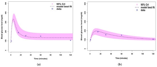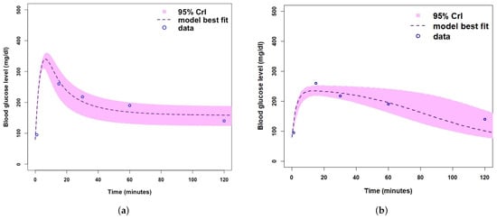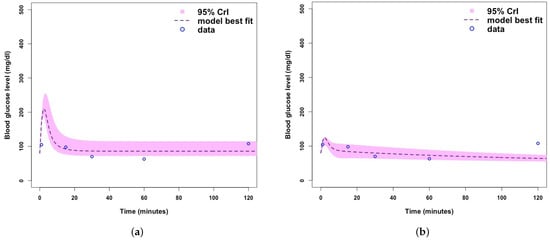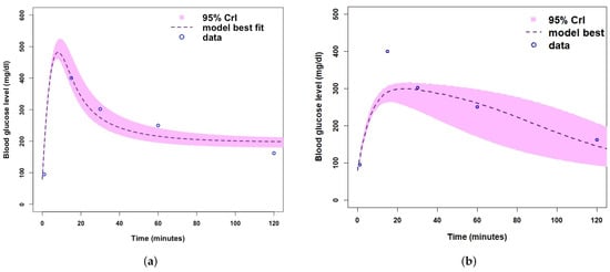 The characteristic of Model 1 in predicting rapid blood glucose level peaks is also illustrated in Figure 7. The predicted blood glucose level peak in Figure 7a is similar to that in Figure 5a. The fitting of Model 1 to the Mice Group 4 blood glucose dataset is generally good, regardless of the rapid peak; however, it fails to cover all data points. Model 2 fitting to Mice Group 4 does fit very well and has no rapid uncontrollable peak. Model 2 fits the 95% Crls well as the uncertainty range covers all data points. A comparison of Figure 7a,b shows that Model 2 fits better to blood glucose level data for Mice Group 4.