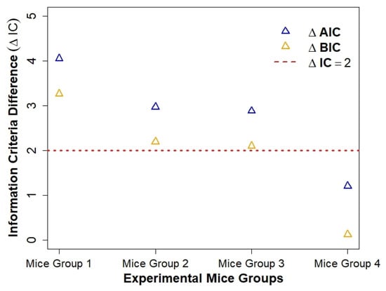 The computed AIC and BIC values for Model 1 and Model 2 for each mice group are presented in Table 4.