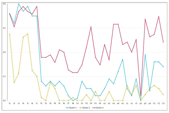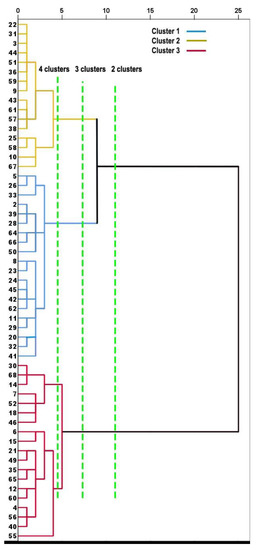 The numbers of clusters and members per cluster were explored by performing cluster analyses of the hierarchical method and the K-means method. The hierarchical agglomerative method with Ward’s linkage produced the dendrogram shown in Figure 1, which suggested that a three-cluster solution would distribute similar numbers of cluster members. The hierarchical and K-means cluster analyses for 2, 3, and 4 cluster solutions (Table 3) indicated that the three-cluster solution yielded from the hierarchical agglomerative clustering was an optimal final solution for grouping similar numbers of cluster members.