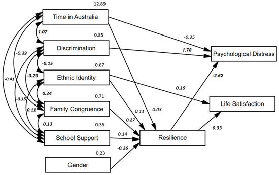 Tests of direct effects and mediation by resilience were considered for all exogenous variables (gender, time in Australia, discrimination, family congruence, ethnic identity, school support) on the two outcome variables of life satisfaction and psychological distress. Discrimination was not mediated by resilience but did have a direct effect on psychological distress. Family congruence and school support were fully mediated by resilience. Ethnic identity was mediated by resilience and had a direct effect on life satisfaction. Significant direct and mediated effects of control and scale variables are shown in Table 3.