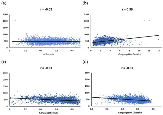 Mortality Correlations and Scatterplots. (a) Adherents; (b) Congregation Density; (c) Adherent Diversity; (d) Congregation Diversity.