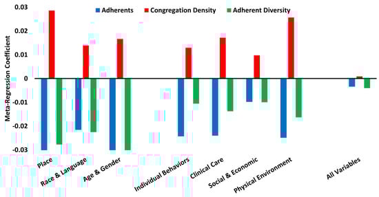 After assessing correlations and collinearity, individual variables were explained as single covariate random effects meta-regression models; multivariate models were then assessed for religion, place (population size and rurality), race and language, age and gender, all demographics, individual behaviors, clinical care, social and economic, physical environment, and all health factors. These full models were then reduced to parsimonious multivariate models. The assessment of added value for religion for demographic and health factors were carried out using parsimonious models.