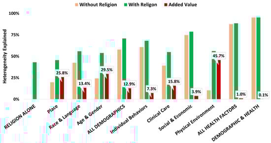 Figure 3 portrays the added value of religion when assessing between-county mortality heterogeneity when controlling for individual demographic and health factor constructs, as well as when controlling for all demographics; all health factors; all demographics and health factors (using parsimonious models). The religion construct alone (Table 3) explains 43.2% of between-county mortality. Depending on how much is explained by separate demographic and health factor constructs, the added value of religion ranges from 7.3% (when added to Social and Economic) to 45.7% (when added to Physical Environment). The added value of religion decreases when added to combined models: 12.9% (when added to all Demographics), 1.0% (when added to all Health Factors), to only 0.1% (when added to all Demographic and Health Factors).