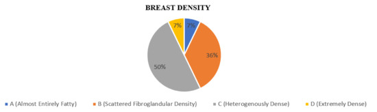 The breast composition was divided according to the American College of Radiology (ACR) BI-RADS lexicon. The majority of patients had breast density c, which comprised 50% (N = 7), followed by density b 36% (N = 5) and 7% for both density a and d (N = 1), as shown in Figure 2.