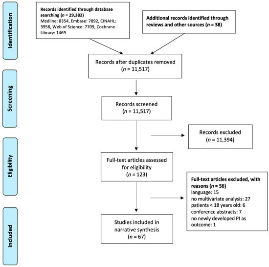 The search strategy was implemented in end of January 2020 and beginning of December 2020 with overall 29,382 search results (Figure 1). Together with 38 studies added through other reviews and sources, deduplication took place with 29,420 studies where, ultimately, 11,517 results remained. Screening of titles and abstracts was done with 11,517 entries where 123 studies were deemed appropriate for full-text analysis. In the end, 67 studies were included in narrative synthesis, with 32 prospective cohort studies [18,19,20,21,22,23,24,25,26,27,28,29,30,31,32,33,34,35,36,37,38,39,40,41,42,43,44,45,46,47,48,49], 26 retrospective record reviews [50,51,52,53,54,55,56,57,58,59,60,61,62,63,64,65,66,67,68,69,70,71,72,73,74,75], and nine RCTs [76,77,78,79,80,81,82,83,84] with a total sample of 679,660.