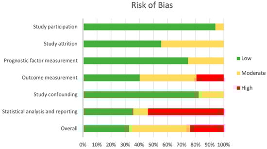 - Hayden, J.A.; van der Windt, D.A.; Cartwright, J.L.; Côté, P.; Bombardier, C. Assessing bias in studies of prognostic factors. Ann. Intern. Med. 2013, 158, 280–286. [Google Scholar] [CrossRef]