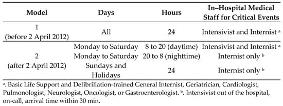 On 2 April 2012, in order to reduce spending, our general hospital shifted from an organizational model where intensivists stayed in the hospital during holidays, weekends, and at nighttime (Model 1) to a new model where intensivists were only available on call from outside the hospital (Model 2). In this way, the intensivist’s working hours were accrued only in cases of intervention and the new hires were limited.
