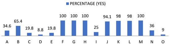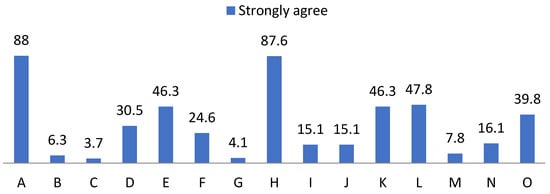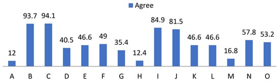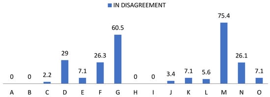 Percentage of “Disagree” from the self-esteem questionnaire. For the understanding of Figure 3, Figure 4 and Figure 5, the items observed in them correspond to: Items that are part of the self-esteem questionnaire. A: Appreciation. B: Failure. C: Qualities. D: Dignity. E: Pride. F: Positive attitude. G: Satisfaction. H: Value. I: Undervalue. J: Inequality. K: Change of attitude. L: Hide feelings. M: Discomfort. N: Fear of losing sympathy. O: Fear of rejection.
