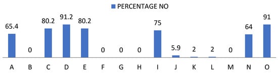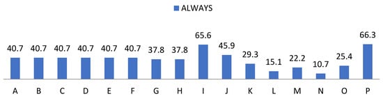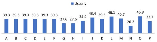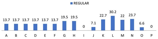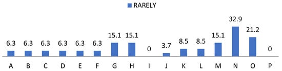 Percentage of “Rarely” from the teacher perception questionnaire. For the understanding of Figure 7, Figure 8, Figure 9 and Figure 10, the items observed in them correspond to: Items that are part of the teacher perception questionnaire. A: Available. B: You win. C: Attitude. D: Intent. E: Interest. F: Motivation. G: Compression. H: Expression. I: Aptitude. J: Behaviour. K: Inventiveness. L: Restlessness. M: Communication. N: Over traction. O: Participation. P: Learning.