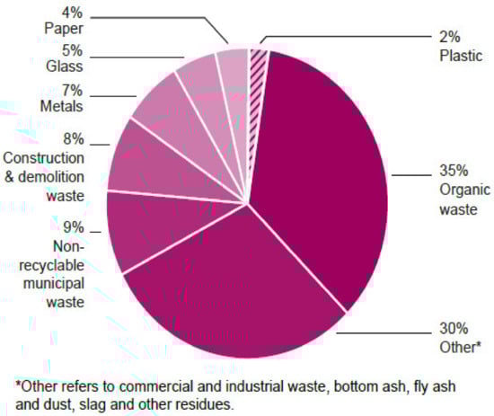 Approximately 2% of general waste in South Africa is plastic (Figure 1) [] and mostly ends up in landfills as it is the widespread waste management conventional approach globally; however, the dearth of landfill spaces is becoming a major problem [,]. As a result of the types and quantities of harmful compounds present in landfills, as well as their potential for leaching, there is growing public health and environmental concern about landfill effects []. Government and other stakeholders worldwide aim to minimise the quantity of waste that is landfilled, but this has been difficult to achieve because approximately 90% of South Africa’s municipal waste is still landfilled [], compared to 20%, 37% and 60% in Germany, France and England, respectively []. Although there is a risk of groundwater and soil contamination from disintegrating plastic additives and leftovers that can linger in the environment for a long time [], public health and environmental pollution hazards can be mitigated if landfills are effectively managed.