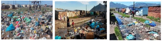 In South Africa, the terminology “township” or “location” usually relates to the largely underdeveloped racially divided metropolitan areas that were earmarked for non-whites, primarily Indians, Africans, and people of colour, from the late 19th century until the fall of apartheid, and they were typically constructed on the outskirts of towns and cities []. As of 2007, a quarter of South Africa’s population was indicated to be living in the 76 largest townships []. Overcrowded communities in developing cities, despite being linked to municipal water supply, struggle with constant water delivery due to ageing infrastructure, which results in inconsistent availability, and the community in these situations, relies on unofficial water sources to survive [] that are typically polluted rivers which are laden with heavy metals, diseases, and organic waste []. The average number of persons living in shacks is 3.1, with 28% of shack family units experiencing congestion, while a household is considered over-crowded if there are more than two people per room []. Because of the poor level of official waste management in these locations [] (see Figure 2), the communities are at risk of water and/or airborne ailments []. In addition, as the world’s population grows, so does the demand for water []. The wealthier the economy and the greater the proportion of people living in townships, the more waste and pollution is produced []. As a result, waste creation is inevitable, and finding environmentally friendly, economically viable, and socially beneficial waste management methods and technologies has become a major source of concern []. Several stakeholders perform a vital role toward ensuring that the current waste management systems succeed, but according to the Constitution of South Africa (Act 108 of 1996) and the Municipal Systems Act, 2000, the municipalities are delegated the responsibility of waste collection, waste disposal and waste cleaning services to all its residents [].