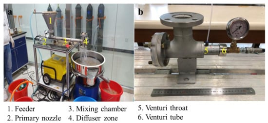 A washing ejector is a pretreatment technology used to disperse soil aggregates by cavitation flow. In the washing ejector, the cavitation behavior is governed by the fluid velocity and pressure according to hydrodynamic cavitation. The washing ejector developed in this study is a device that utilizes fast liquid jets to remove pollutants. In these experiments, tap water was used as the fluid. Figure 1a shows a schematic diagram of the washing equipment on a small scale. The washing ejector comprises a feeder, a primary nozzle, a mixing chamber, and a diffuser zone. Figure 1b show the photographic details of the cavitating device and a nozzle. A nozzle was attached to a cavitating device connected to a washing ejector. The diameter of the Venturi tube (D) was 5 mm, and the throat diameter (d) was 3 mm, with a diameter ratio of 2.78. The dimensions of the Venturi tube chosen in this study were based on a numerical study on the optimization of geometrical parameters on the cavitation inception. The static pressure at the Venturi throat was measured using a digital pressure gauge (PX409-015GUSBH, Omega Engineering Inc., Norwalk, CT, USA). The outlet pressure remained constant and was equal to atmospheric pressure. The feeder was set at the top of the chamber, and the nozzle was parallel to the axis of the washing ejector. The fluid was sprayed from the cavitating device into the mixing chamber zone, where soil was completely mixed via the feeder, and then sieved by vibrating a 0.053 mm screen instrument. The study soil is made up of a mixture of natural aggregates. In particular, the fine particles containing toxic heavy metals were composed of metal phase included in phyllosilicates and metal phase weakly bound on surface phyllosilicates. The fine clay minerals were removed by a washing ejector. The cut off size of the treated soil was set as size 0.053 mm considering the loss of fine particles.