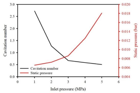 The hydrodynamic condition presented as the effect of inlet pressure on cavitation number and static pressure.