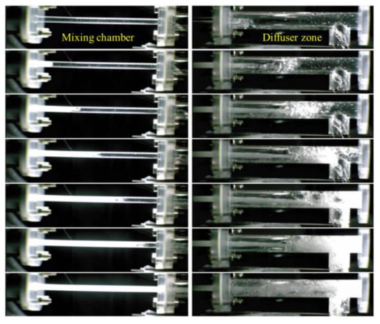 Eventually, the static pressure affected the cavitating flow in the washing ejector. As can be seen, the gauge pressure ascends as the static pressure difference increases and the cavitation number was gradually decreased. These results demonstrated that the static pressure ascending could promote the inception of cavitation and the cavitation number is a suitable estimate of cavitating flow. The cavitation generation point corresponds to Cv = 1, and cavitation occurs when Cv < 1. The experimental results showed reasonable agreement with the CFD results for cavitation behaviors published in the literature [,,]. Therefore, in this study, the fluid pressure was 5 MPa using the characteristics of the cavitating flow. Figure 3 presents the visualization of cavitating flow generation in the washing ejector.