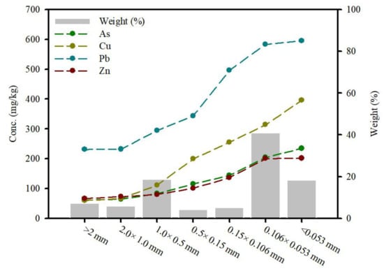 The concentrations of toxic heavy metals in the contaminated soil are summarized in Table 1. The samples were contaminated with As, Cu, and Pb and their concentrations were 25 mg/kg, 150 mg/kg, and 200 mg/kg, respectively, which exceeded the cleanup level of the Korean Soil Environment Conservation Act (KSECA). The Zn concentrations of the soils were below the levels of concern of KSECA (300 mg/kg). A size separation study was conducted in order to measure the contaminant concentration in the soils with different particle sizes (Figure 4). The results demonstrate that the finer soil particles had higher toxic heavy metal concentrations compared to the coarser soil particles. This is because fine soil particles have greater sorption capacities due to their larger specific surface area. Therefore, the particle size analysis demonstrates that contaminants adsorb on clay and silt to a greater degree compared to sand. The soil particles were divided into seven fraction sizes, >2.0 mm, 2–1 mm, 1–0.5 mm, 0.5–0.15 mm, 0.15–0.106 mm, 0.106–0.053 mm, and <0.053 mm. The distribution of the soil was determined by the weight of each sieve after sieving, which corresponded to 7.17%, 5.87%, 18.6%, 4.16%, 5.00%, 40.9%, and 18.3%, respectively, of the bulk soil sample. Overall, the distribution characteristics were significantly related to the particle size and the contaminated soil concentration.