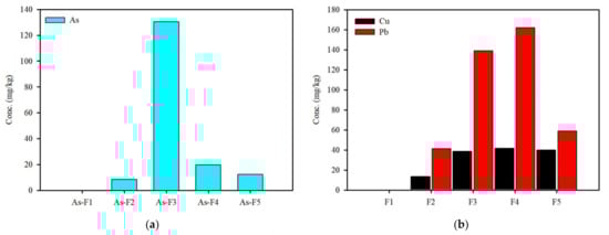 Sequentially extracted metal fractions from the contaminated soil. For As, each fraction represents: (a) (As-F1) non-specifically sorbed; (As-F2) specifically sorbed; (As-F3) amorphous oxide-associated; (As-F4) crystalline oxide-associated; (As-F5) residual. For Cu and Pb, each fraction represents (b) (F1) exchangeable; (F2) carbonate; (F3) amorphous Fe and Mn hydroxide; (F4) organic matter bound and sulfide; (F5) residual.