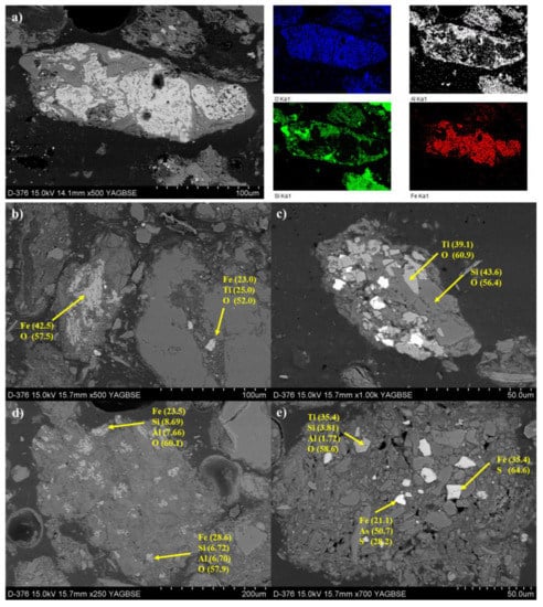 In the microscopic image of the polished section, the mineral phases were observed in the form of quartz, Ti oxide, and Fe oxides, such as hematite and magnetite. Soil mineralogy is a combination of primary components (i.e., phyllosilicate) and secondary phases produced by industrial activities and weathering processes. Secondary phases sizes range from <1 μm to about 30 μm. The microstructure of the polished section, investigated through SEM-EDS analysis, was composed of Fe oxides embedded within the silicate matrix. Fe oxide was visible in back-scattered electron (BSE) images as a white halo on light gray particles. The elemental mapping by EDS in Figure 7a shows four different compositional regions of Al, Si, Fe, and O. The focus on the zones with light gray particles indicate that Fe- and Ti-oxides impregnated the space of the silicate grains (Figure 7b–e). These secondary phases were present as discrete euhedral to subhedral grains with irregularly shaped morphologies. According to the elemental composition analysis of the individual light gray particles, the minerals within the silicate matrix can be classified into the following groups: Fe-O, Fe-Ti-O, Ti-O, Al-Si-O, and Fe-As-S. Minerals associated with Al, Si, Ti, and Fe were characterized as silicate minerals and Fe and Ti-oxides. The SEM images reveal the variety of metallic oxide phases identified in the soil. These phases might release metals when subjected to weathering processes or during water–soil interaction.