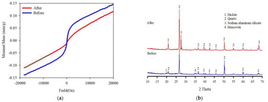 All experiments were preceded by a washing ejector using the characteristics of the cavitating flow. Soil and water were mixed in a washing ejector with a mass ratio of 1:2. After the pretreatment, the mixture was separated by a vibrating screen (0.053 mm) to obtain treated soil. The results of the magnetic susceptibility measurements at room temperature displayed differences depending on both before and after the treatment with the washing ejector. The saturation magnetizations of before and after treatment were found to be approximately 0.15 and 0.12 emug−1, respectively (Figure 8a). The magnetic properties of the soil before processing may be due to the presence of a relatively large amount of clay and fine soil particles. Figure 8b presents XRD patterns that show variation in the structure of the phyllosilicate in the treated soil with the washing ejector. These results clearly show that the cavitating flow effectively removed the fine particle fractions of the soil. Therefore, the variations in quartz peak intensities indicate that the grains surrounded by clay minerals containing Fe oxide were liberated. Moreover, this is due to the existence of a large amount of diamagnetic materials, such as quartz.