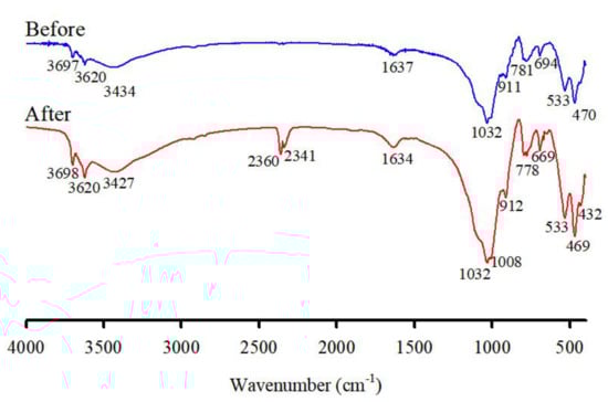 The obtained infrared spectroscopy spectra of the soil showed the characteristic bands of its main functional groups (Figure 9). The main groups are the OH groups, which are mainly structural groups in the soil, adsorbed water molecules, stretched carboxyl group groups, Si-O stretching, Si-O-Si stretching, and Si-O-Al stretching [,]. The characteristic bands of 3697, and 3620 cm−1 correspond to the stretching vibration of the hydroxyl groups (OH) of Si and Al, respectively, in the clay minerals. Meanwhile, the absorption peaks at 1637 cm−1 can be attributed to the C=O stretching vibration of the carboxyl group (-COO) [,]. The Si-O-Si band is observed at 1032 cm−1 as a result of the Si-O vibration. The band at 911 cm−1 corresponds to the OH deformation of hydroxyl groups. The Si-O bending vibration modes at 694 and 781 cm−1 are characteristic frequencies of quartz.