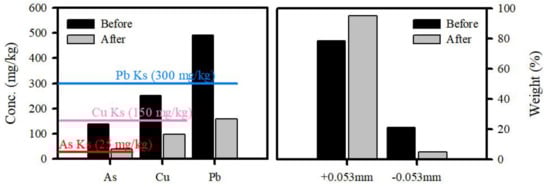 A washing ejector can be effective in reducing the removal of fine particles. The results show that the efficiency of toxic heavy metals removal greatly improved (Figure 10). The treated soil concentration decreased from 139.5 to 39.3 mg/kg (As), 252.4 to 98.5 mg/kg (Cu), and 490.7 to 158.6 mg/kg (Pb). The residual concentrations of toxic heavy metals, including Cu and Pb were below the cleanup level of KSECA. Notably, a greater amount of fine fractions (−0.053 mm) was observed in the original soil sample (i.e., untreated soil) than in the treated soil, implying that more fine particles were bound to particles in the original soil.