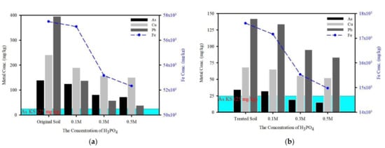 Effect of phosphoric acid concentrations on enhanced toxic heavy metals extractions from the original soil (a) and treated soil (b).