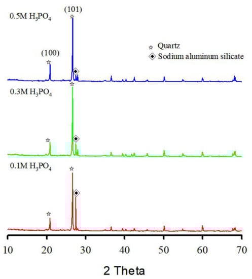 Phosphoric acid is polyprotic and can release more H+ (Equations (2)–(4)), which is conducive to the removal of cationic metals under acidic conditions. The soil samples washed with phosphoric acid were characterized by XRD (Figure 12). After soil washing, the XRD patterns of the washed soil showed that sodium aluminum silicate and quartz peaks were present as the (100) and (101) plane intensity increased compared with before the reaction of the treated soil. However, when the washed soil reacted with phosphoric acid, the sodium aluminum silicate peak intensity decreased with increasing phosphoric acid concentration. As the consumption of phosphoric acid continued, the amorphous toxic heavy metal bound to the phyllosilicate surfaces was extracted, which led to the dissolution of sodium aluminum silicate (process described in Equation (5)). Consequently, the washing ejector demonstrates that the soil particles containing toxic heavy metals are predominantly composed of amorphous toxic heavy metal bound to the phyllosilicate surfaces rather than encapsulated in the phyllosilicates.