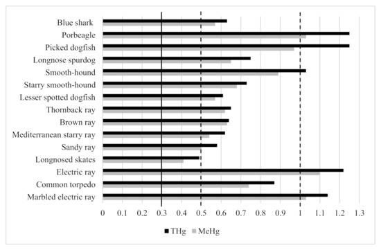 - Nicolaus, E.E.M.; Barry, J.; Bolam, T.P.C.; Lorance, P.; Marandel, F.; McCully Phillips, S.R.; Neville, S.; Ellis, J.R. Concentrations of mercury and other trace elements in two offshore skates: Sandy ray Leucoraja circularis and shagreen ray L. fullonica. Mar. Pollut. Bull. 2017, 123, 387–394. [Google Scholar] [CrossRef] [PubMed]