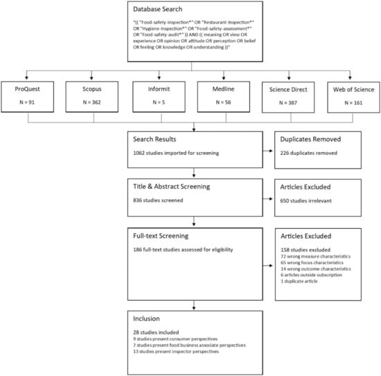 Inclusion criteria were formulated in extension of the search protocol and were applied in two stages. Firstly, to the title and abstract screening phase where they guided inclusion based on participant characteristics, focus characteristics, methodological characteristics, and outcome and measure characteristics. Later, the criteria were applied to the full text screening phase in a more judicious manner, particularly in examining articles on whether they presented views or perceptions toward food safety inspection, whether those views or perceptions were drawn directly from participants or the author, and whether those views or perceptions are toward food safety inspection or attributes immediate to the construct. While the majority of articles were excluded as they did not offer beliefs or perceptions toward food safety inspection, some were excluded because the voices of respondents had been lost where results had been homogenized, while others were excluded due to the constriction of expression imposed on respondents by their survey design.