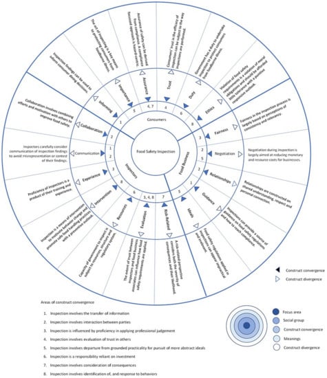 The meaning of inspection varies considerably between consumers, food business associates, and food safety inspectors and given this division of views, the results are presented grouped into those attributable to consumers, food business associates, and food safety inspectors. To aid in the categorization and derivation of meanings identified in this review, each meaning was examined for points of commonality and difference with others. Figure 3 provides an overview of this analysis, depicting points of conceptual convergence and divergence. In the analysis, each meaning was found to share a point of commonality with at least one other meaning. This sharing of commonalities has been referred to here as construct convergence. The categorization and ultimate determination of category boundaries was established where points of variation between meanings were found sufficient for them to be experienced or interpreted differently. These points of variation are referred to here as construct divergence.