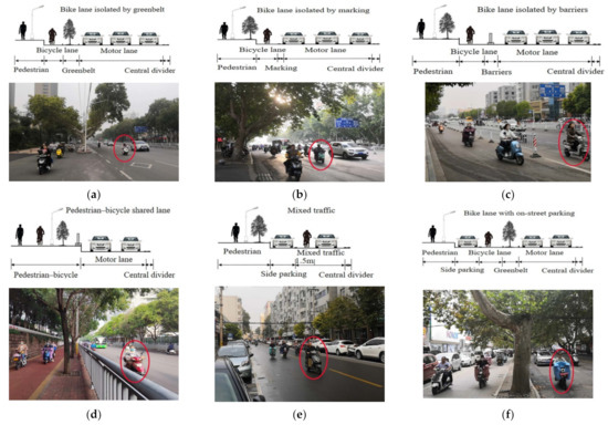 Different types of bike facility configurations: (a) Bike lane isolated by greenbelt; (b) Bike lane isolated by marking; (c) Bike lane isolated by barriers; (d) Pedestrian–bicycle shared lane; (e) Mixed traffic; (f) Bike lane with on-street parking. Red marks indicate that cyclists occupy motorized vehicle lanes.