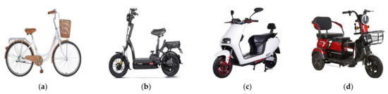 Bike types: (a) Bicycle; (b) E-bike; (c) E-scooter; (d) Electric tricycle.