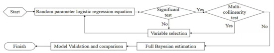 This study proposes a Bayesian random parameter logit model to investigate the risk factors affecting cyclists occupying motorized vehicle lanes to account for the unobserved heterogeneity. In comparison with the fixed-parameter standard logit model, the random parameter logit model allows all parameters to vary randomly across observations. It considers the unobserved heterogeneity of explanatory variables in cyclists occupying motorized vehicle lanes. Thus, more features in the data can be extracted, and the accuracy of the model can be improved. A diagram for this methodology is shown in Figure 3.