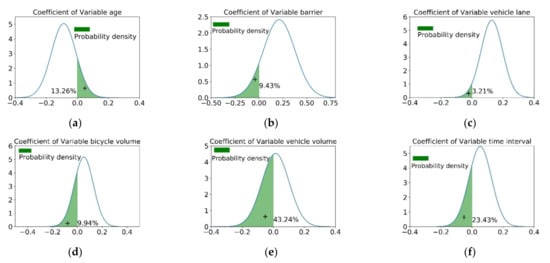 Distribution of parameters estimation for variables. (a) Distribution of parameters estimation for age; (b) Distribution of parameters estimation for barrier; (c) Distribution of parameters estimation for vehicle lane; (d) Distribution of parameters estimation for bicycle volume; (e) Distribution of parameters estimation for vehicle volume; (f) Distribution of parameters estimation for time interval.