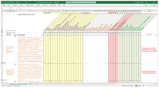 All transcripts were coded following an open and axial coding strategy [40] and analysed using pattern analyses through the lens of agency as explained in the Introduction. The first author, who led the pattern analyses, read all the interviews thoroughly and identified and marked those parts where participants discussed their own or their children’s psychosocial problems or stress. Additionally, ways of dealing with problems, and used or needed resources, were marked. The second author went through the interviews independently with similar questions, and together the first and second authors came to an agreement about which fragments might give us information about parents showing a certain kind of agency—or lack thereof. We copied all 126 selected fragments into a Microsoft Excel file and the first author summarised every fragment into one short sentence. These summaries were used to create a preliminary set of labels. We assigned one or more labels grounded in the content of the fragment (e.g., ‘hiking in nature’, or ‘finding distraction’) to every fragment. The next phase consisted of rereading and assigning codes to every fragment. The number of codes per fragment was unlimited; when necessary, a new label was created, and the earlier coded fragments were examined again. During the axial coding phase, patterns in the labels were sought and categorised. The labels were divided into three categories: the category WHAT, the category WHO, and the category HOW. In the WHAT category there are labels about what subject the participant talked about (such as work, shame, home), or what action they took (such as initiative, love and attention, seek help). In the WHO category, there are labels about who they are talking (such as self, child, partner, family), and where they find solace (such as religion, nature, physical exercise, school, health care professional). In the HOW category, labels for emotions or experiences were gathered (such as positive/optimistic, equal/self-confidence, angry, suspicious, rejection). This resulted in 17 labels in WHAT, 11 labels in WHO, and 14 labels in HOW. The second author checked all steps from the selection fragments to the labelling and categorizing of the labels.