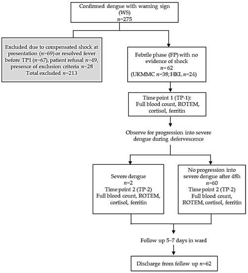 A prospective study was conducted in Universiti Kebangsaan Malaysia Medical Center (UKMMC) and Kuala Lumpur General Hospital (HKL) from June 2018–March 2019 (9 months). There were 275 patients aged ≥13-years with confirmed dengue and warning signs screened into the study, and 62 patients were eligible for recruitment (Figure 1). Dengue NS1 and IgM/IgG were performed using a rapid immune-chromatographic test (UKMMC) or SD Bioline™ Dengue Duo Rapid kit (Standard Diagnostics, Inc., Gyeonggi-do, Korea). The warning signs were defined as any of the following: abdominal pain, persistent vomiting >3/24 h, persistent diarrhea >3/24 h, third space fluid accumulation (ascites/pleural/pericardial effusion), mucosal bleeding, lethargy/restlessness/confusion, tender liver, and “hematocrit increase” with “platelet decrease” [8]. Median hematocrit values were 46% (male <60 years), 42% (male >60 years), and 40% (female all age) [2]. Platelet decrease was defined as ≤1.50 × 1011/L. The following were excluded: presence of compensated shock or resolved fever, active malignancy, HIV, autoimmune diseases, concomitant corticosteroids/chemotherapy, platelet inhibitors/antagonists, underlying hematological disorders, cirrhosis, or bone marrow metastasis. Time Point 1 (TP-1) referred to febrile phase while Time Point 2 (TP-2) referred to defervescence or onset of severe dengue. The study was approved by medical ethics committees (UKM FF-2018-126, NMRR-18-3124-44643 IIR) and all methods were performed in accordance with the relevant guidelines and regulations. Written informed consent were obtained from all participants and/or legal guardians.