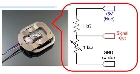 The proposed meal weight-monitoring system consists of four load-cells, a front-end analog amplifier with an analog-to-digital converter (ADC), and an Arduino NANO board with Bluetooth module. Figure 1 shows the picture of a load-cell (which is limited to the maximum weight of 50 kg) and its equivalent circuit, in which it is clearly seen that a weight can change the variable resistance of the load-cell, thus generating a different output voltage from a reference voltage.