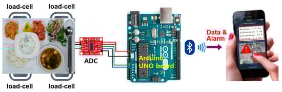 Yet, this configuration may require a critical process called “initial system calibration”, which sets a reference weight for precise measurements. Namely, a calibration factor should be tuned for proper weight information. In this work, the calibration factor was set to 104,000 in the Arduino code. This calibration process typically resets the initial weight to 0 g for start and then measures the precise weight of a meal tray. Here, it should be noted that the weight data can be sensitive to the location of four load-cells under a meal tray, and therefore, each load-cell should be attached to each corner of the tray. Certainly, a tray-shape scale with an identical size would be preferred for this type of weight measurement.