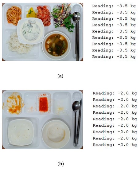 Nonetheless, there exists a merit in this proposed meal weight-monitoring system, which is that the relative amount of food left on a tray can be measured even if the reference weight cannot be calibrated precisely. In other words, even in the cases that nurses forget to tune the calibration factor for precise measurements by any reason, our monitoring system can generate the difference between the original meal weight and the final weight so that the nurses in charge can easily figure out the amount that each patient has eaten. Figure 3 shows an example with an uncorrected calibration factor, where the initial weight is read as −3.5 kg, while the weight of an empty tray when finished is recorded as −2.0 kg. Although the absolute value of meal weight taken by the patient is not shown, nurses and families can see clearly whether the patient has eaten or not.