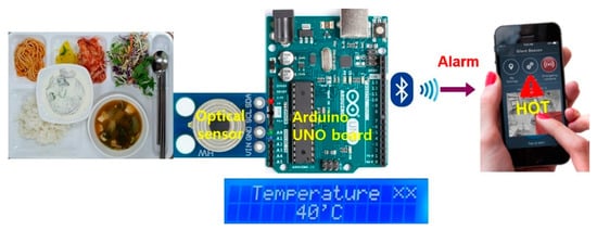 Figure 4 shows a conceptual architecture of the proposed meal temperature-monitoring system in which a non-contact optical sensor and an LCD display are connected to an Arduino NANO board. Besides, a Bluetooth module compatible with an Arduino board can be utilized to transmit the temperature information onto the mobile phones of nurses in charge so that the nurses can serve the patients more effectively, e.g., the cold food can be rewarmed in a timely manner for elderly patients.